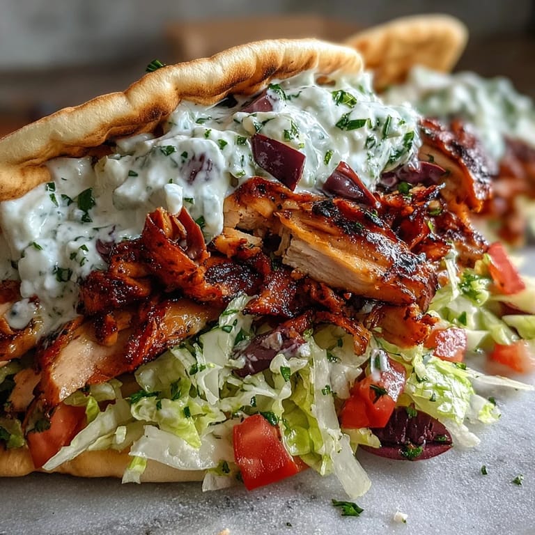 - Lay a warmed pita on a plate, spread a generous spoonful of creamy feta tzatziki in the center, and top with shredded lettuce, diced tomatoes, red onion slices, and Kalamata olives. Pile on the sliced chicken, drizzle with extra tzatziki, and garnish with fresh parsley or mint.