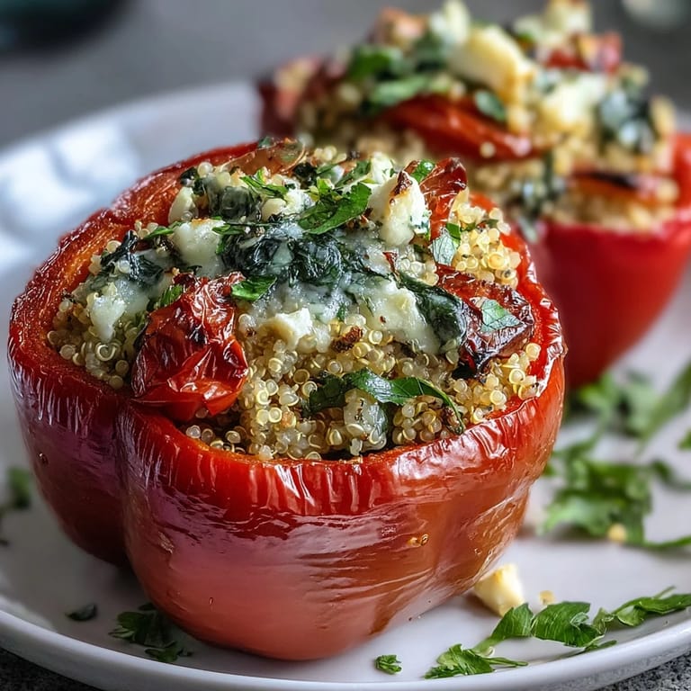 Save There's something magical about the moment you slice into a bell pepper and realize it's become a vessel for something warm and alive. I was standing in my kitchen on an unexpectedly cool spring evening, surrounded by peppers in shades of red, yellow, and orange, when my neighbor mentioned she'd been eating the same sad desk salad for weeks. That conversation sparked something, and I decided right then to stuff these beauties with quinoa and herbs, something colorful enough to make her reconsider what dinner could be. The aroma that filled my apartment as they baked felt like an invitation, not just a meal preparation.